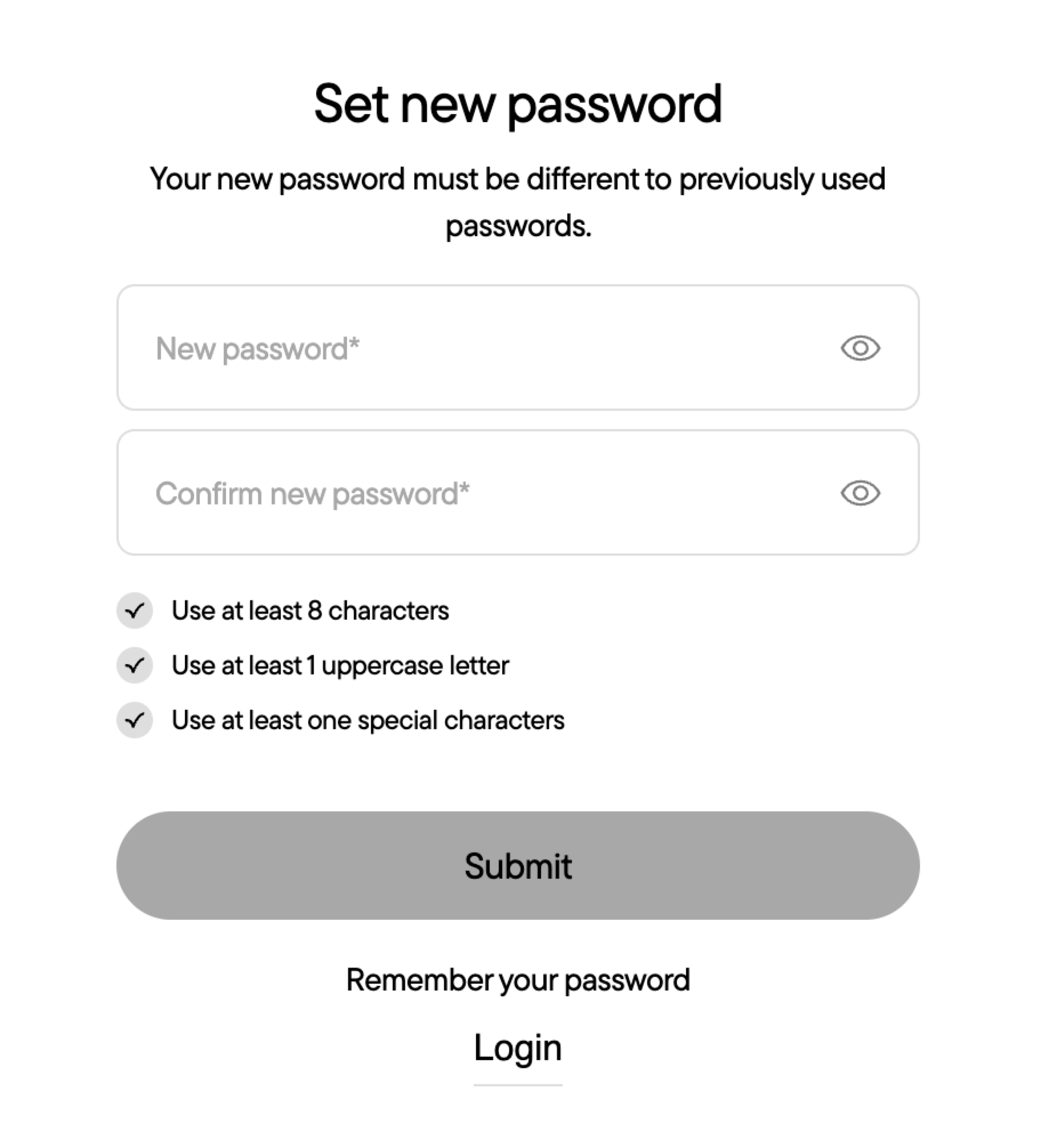 You’ll be taken to a page to create a new password. Make sure your new password is at least 8 characters long, with 1 uppercase letter and a special character.